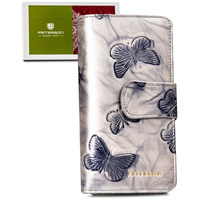 Duży, pionowy portfel damski ze skóry naturalnej w srebrnym kolorze z tłoczonymi motylami - Peterson