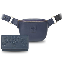 Portfel damski skórzany T-45-DB i brelok do kluczy T-88-BL/DB zestaw prezentowy granatowy Paolo Peruzzi ZUP-107-DB