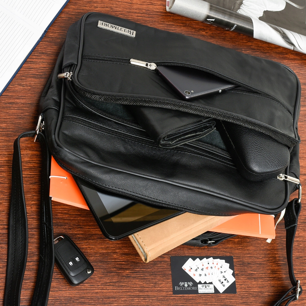 Główna komora zasuwana jest na suwak. W środku pomieszczą się dokumenty formatu A4 i inne, przydatne przedmioty