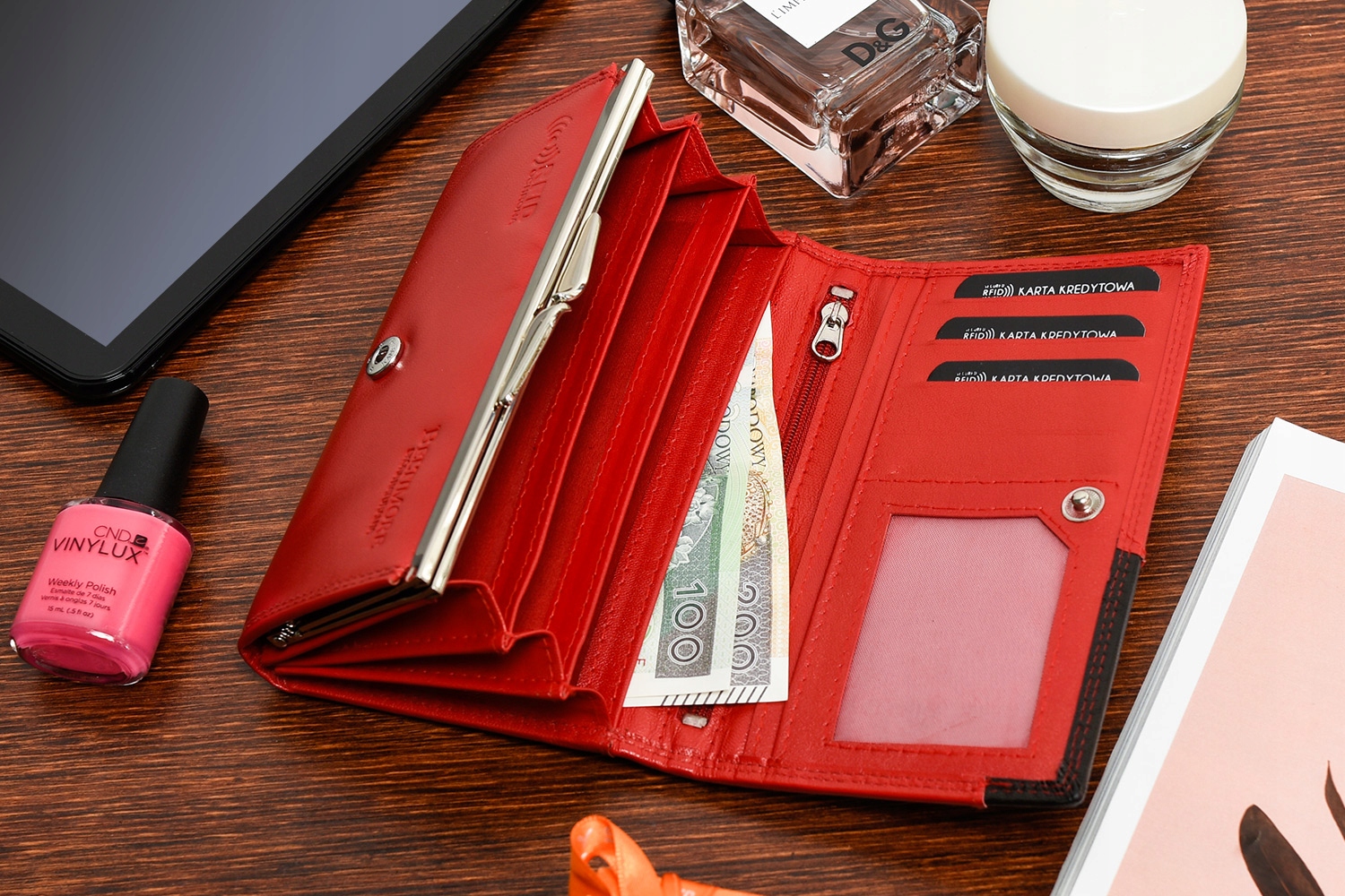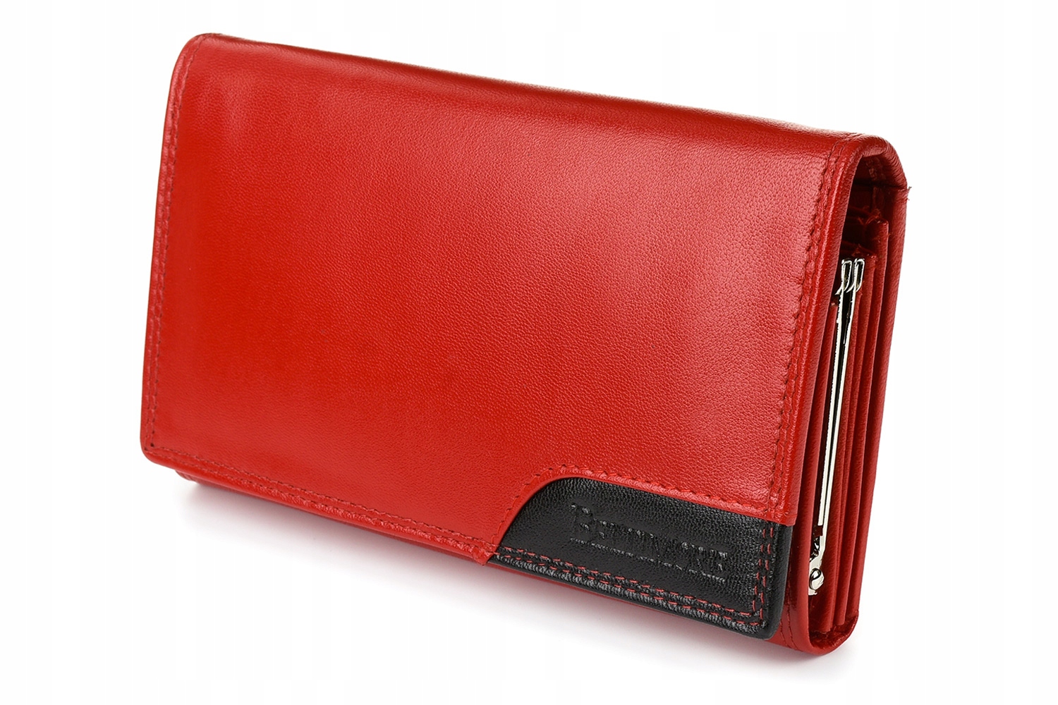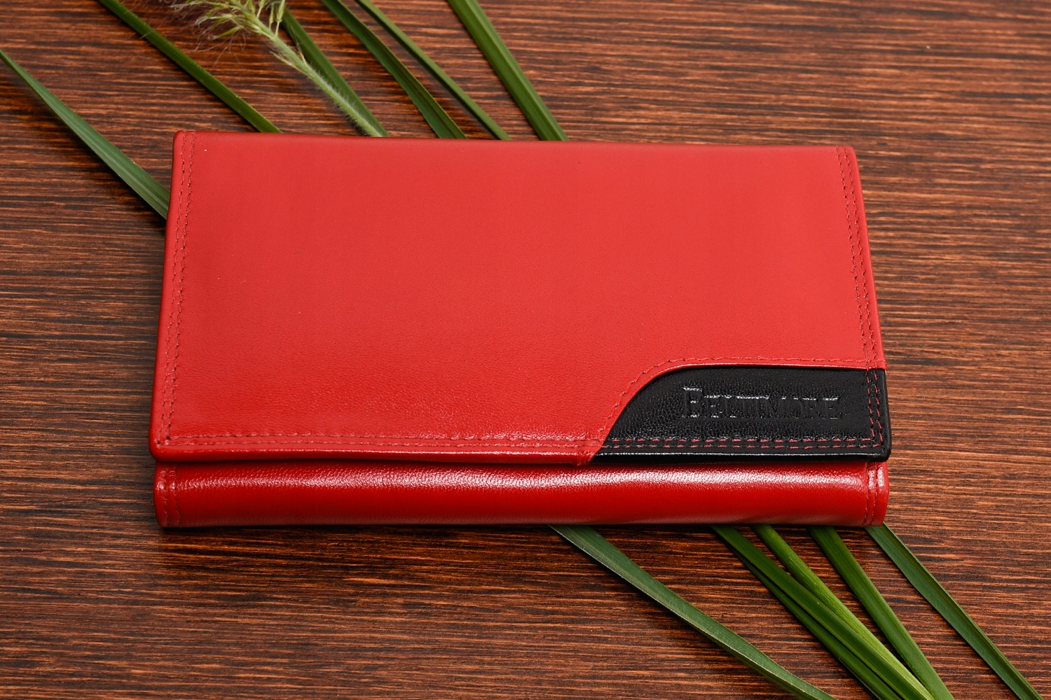 Piękny, skórzany, duży portfel marki Beltimore® w kobiecym stylu, w czerwonym kolorze i elegancką czarną wstawką. Każdy portfel w środku ma dodatkowo bigiel na drobne.