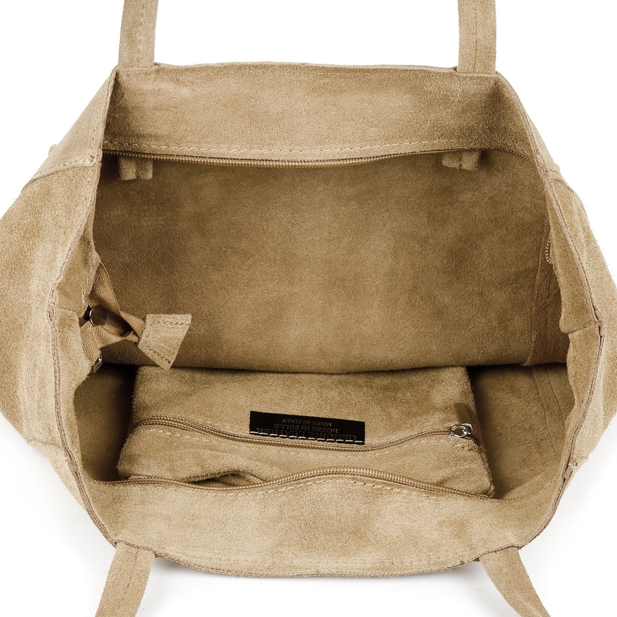 - Dodatkowe informacje: Torebka posiada dwie, niezależne, skórzane (zamszowe) rączki o długości około 54 cm, dzięki czemu można ją nosić w ręku jak i przez ramię