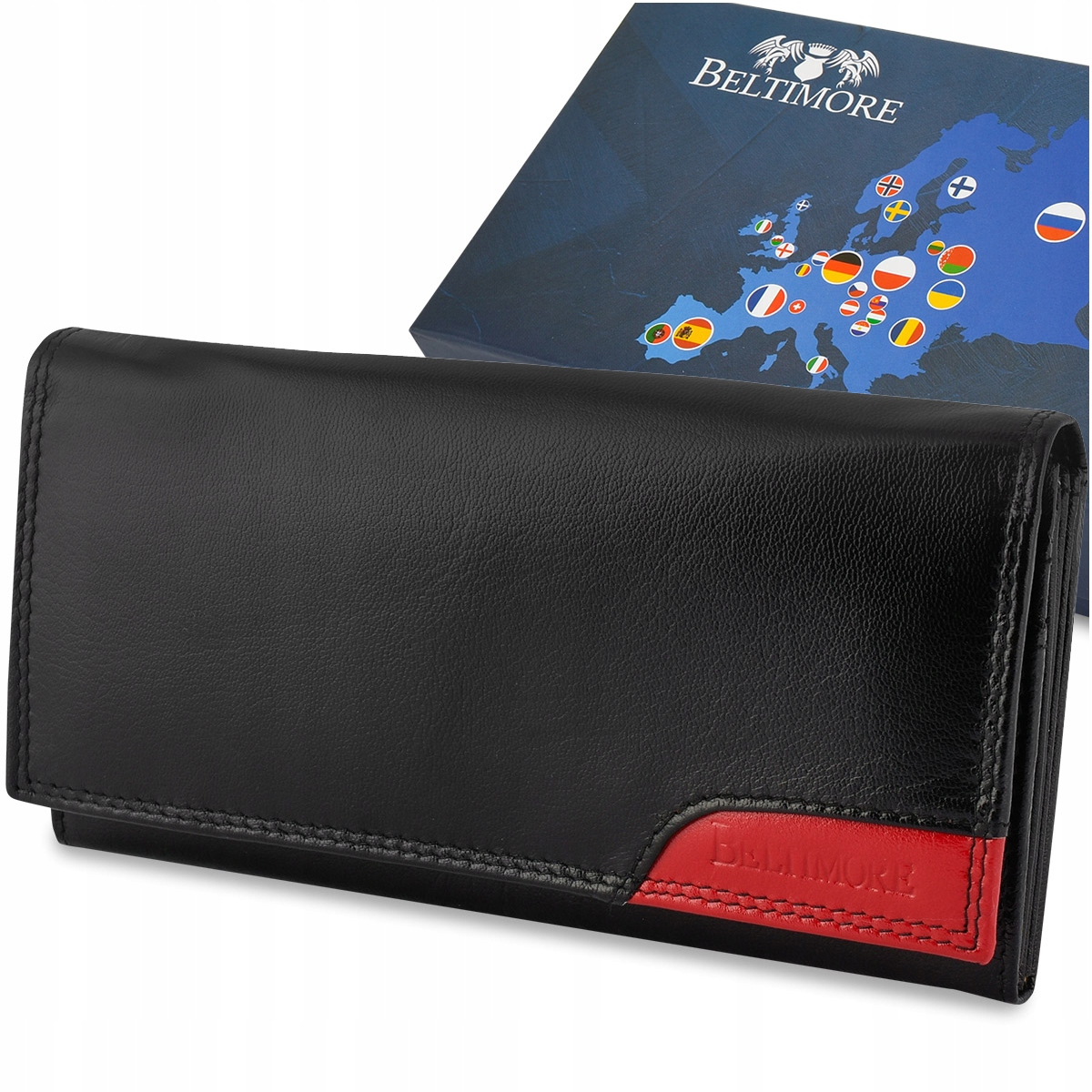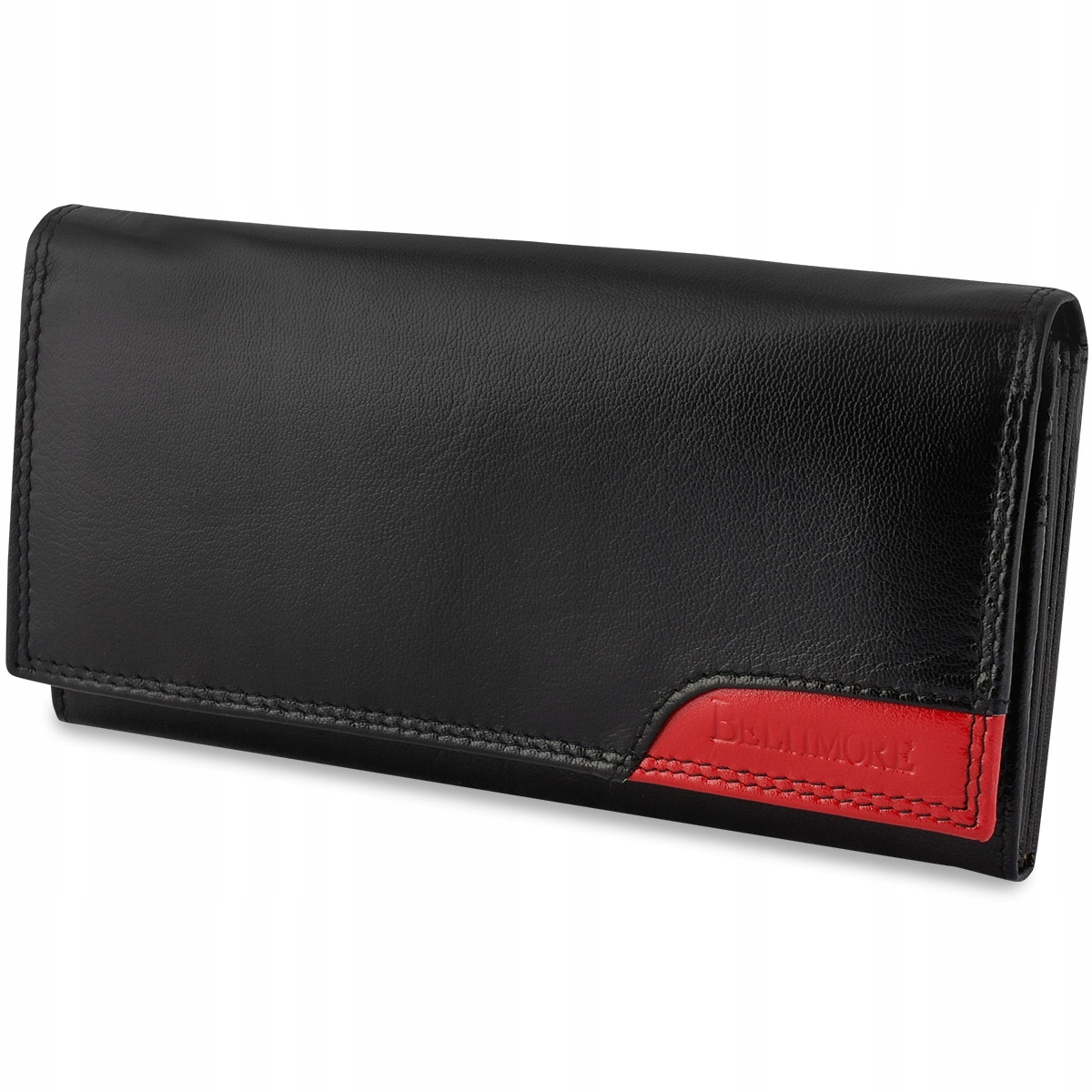 Duży, damski portfel wykonany w całości z bydlęcej skóry naturalnej w pięknym intensywnym, czarnym kolorze z kontrastową czerwoną wstawką. Zamykany jest na bigiel.