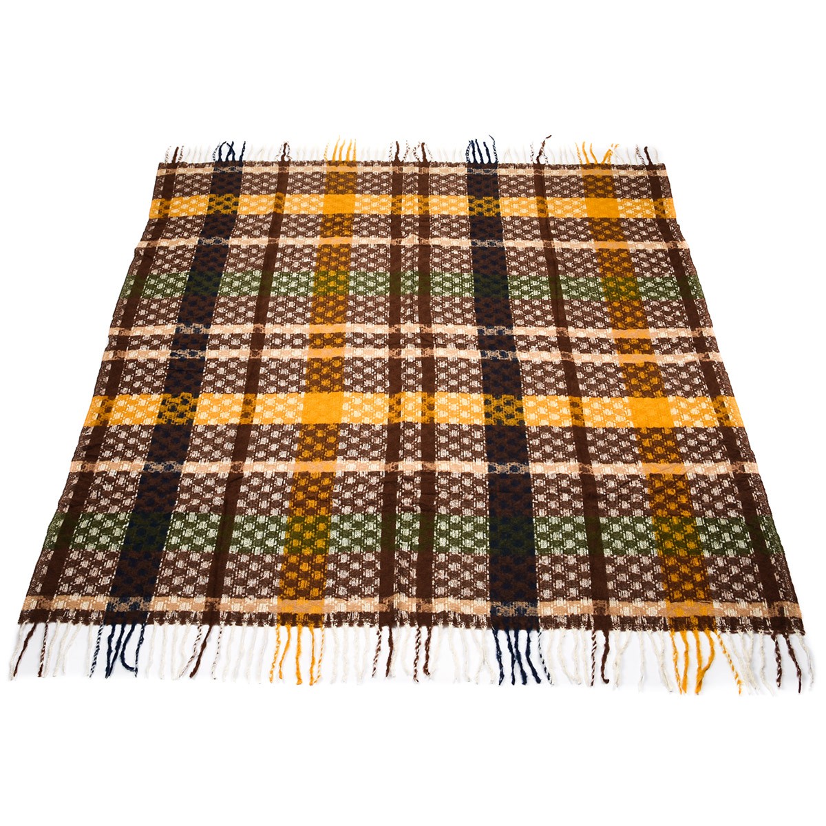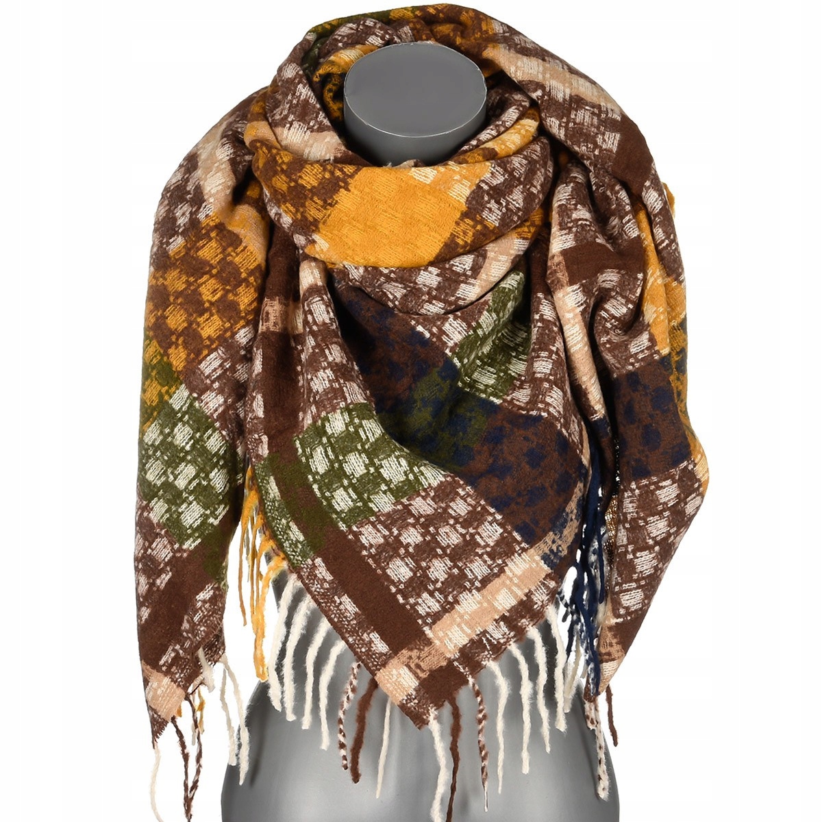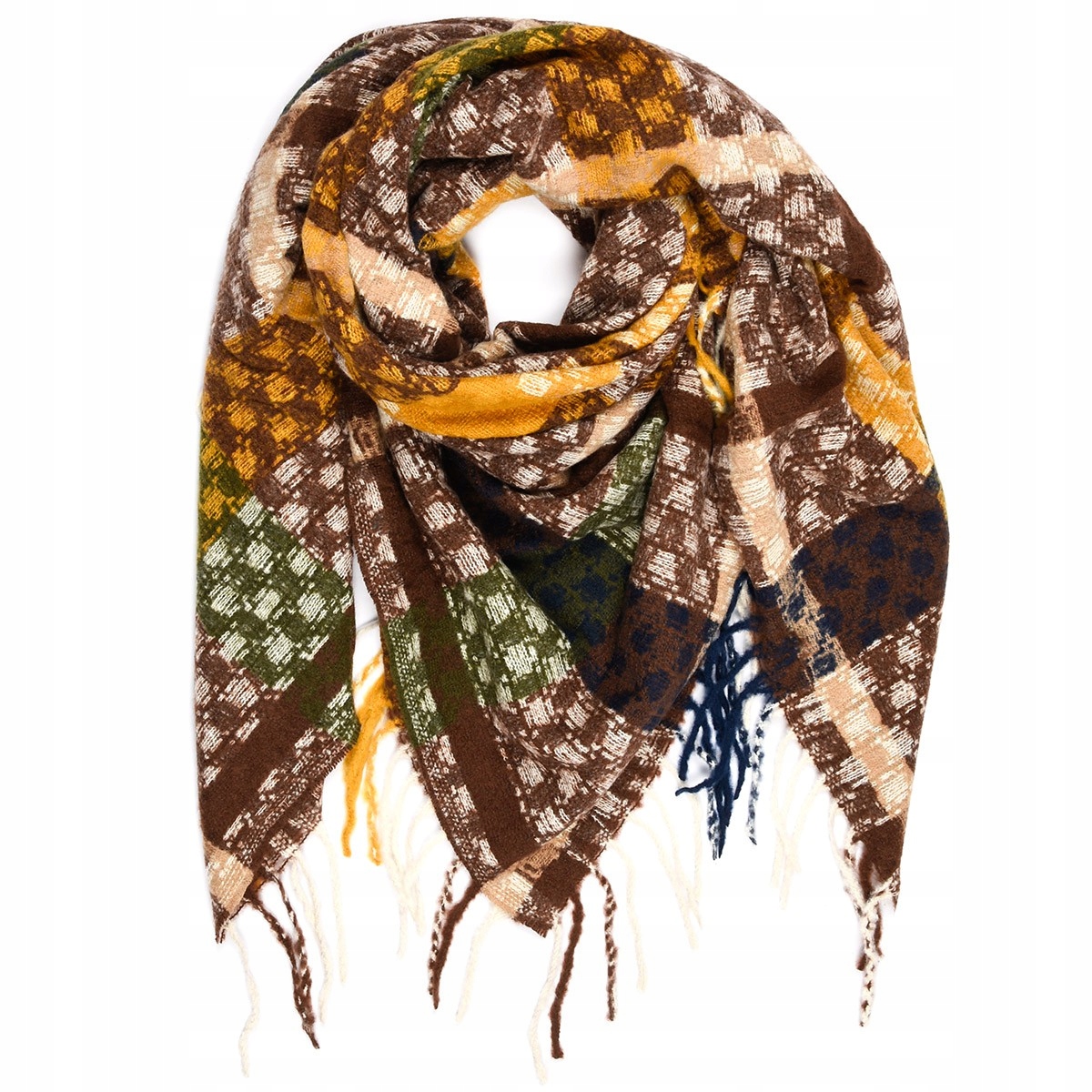 Modny, duży, przyjemny w dotyku szalik damski z oryginalnym wzorem w kratę i frędzlami