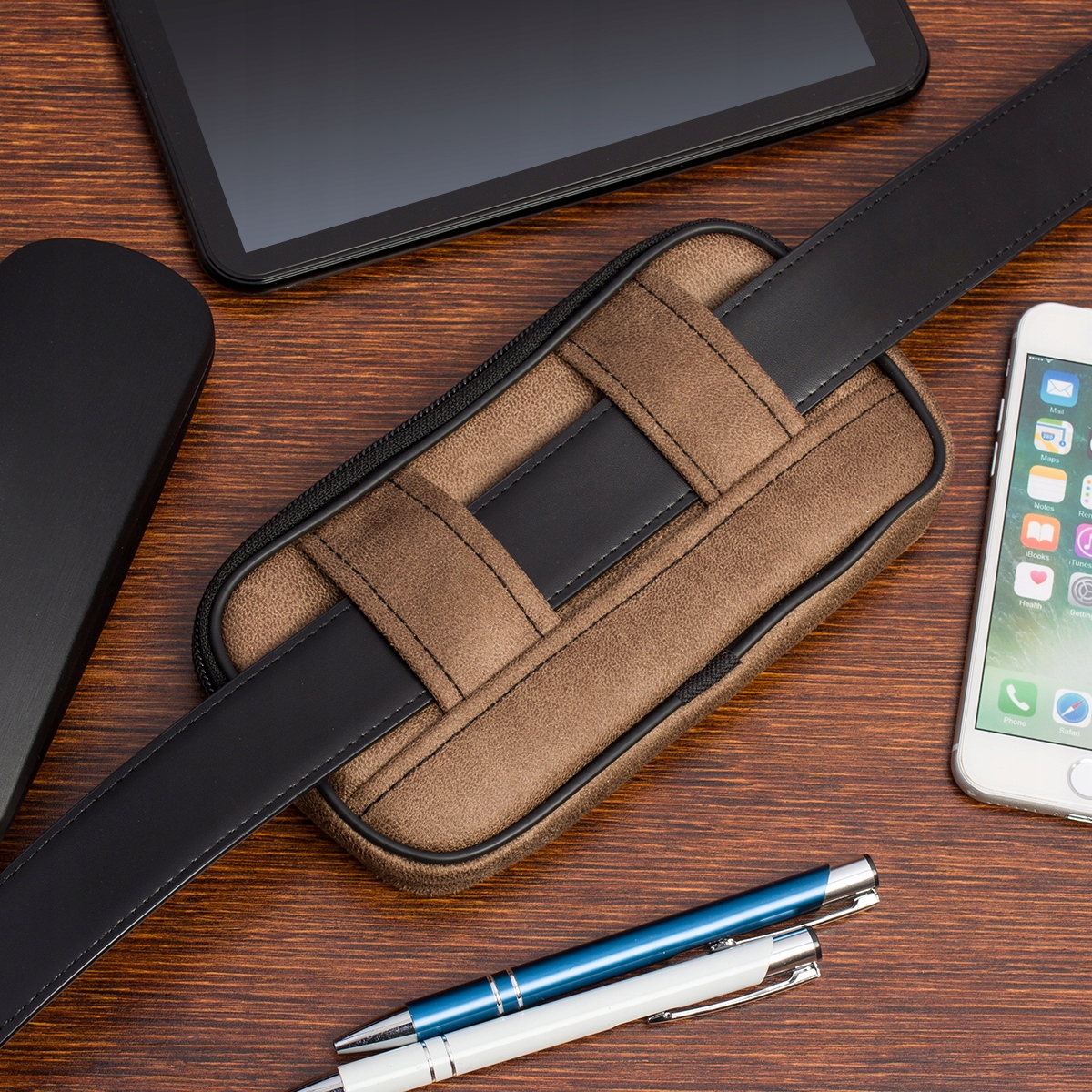 - Przez pokrowiec przeplatamy pasek do spodni, dzięki czemu bezpiecznie możemy nosić saszetkę ze sobą bez obawy, że nam wypadnie- to dodatkowa przestrzeń pod Twoją ręką!