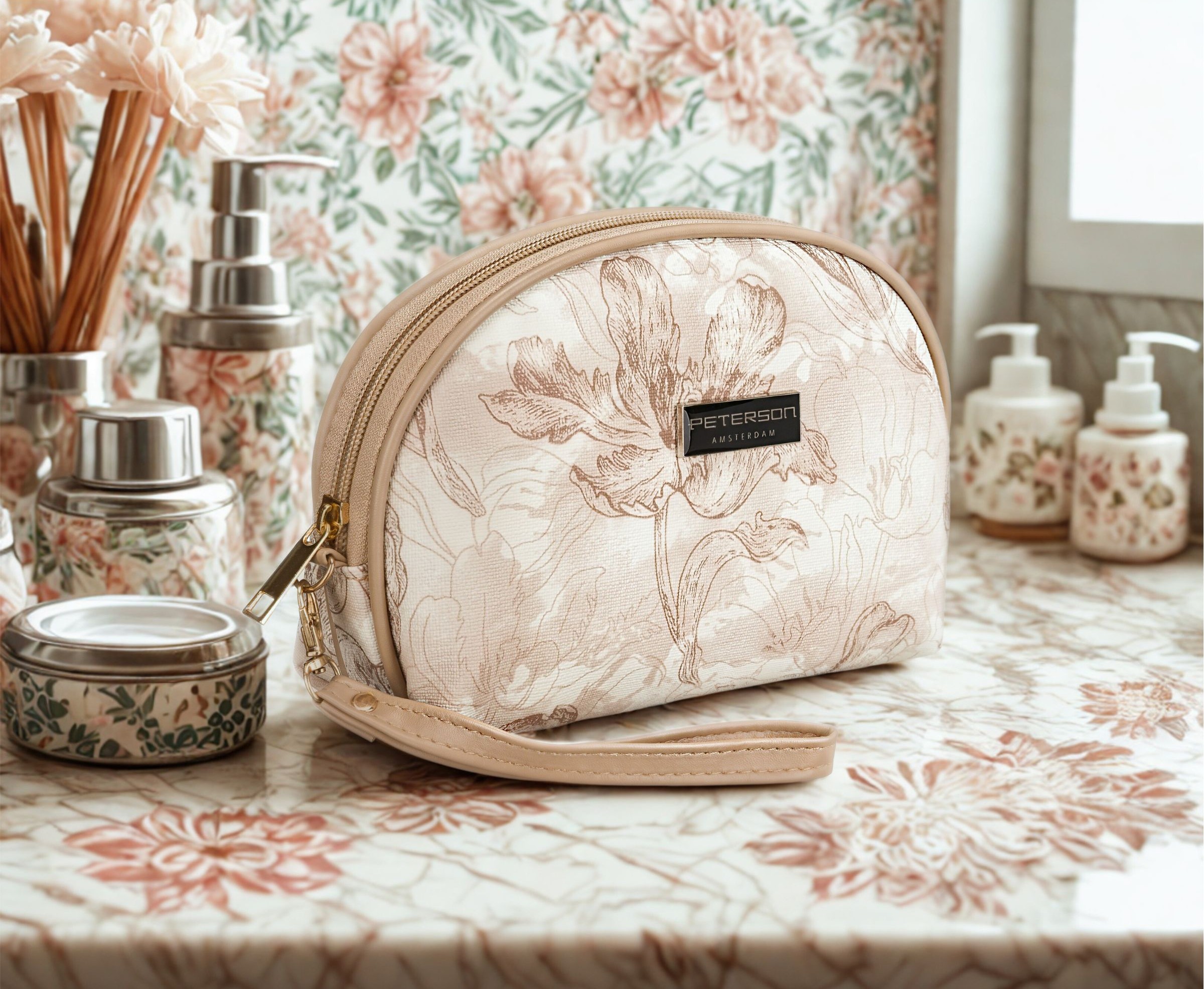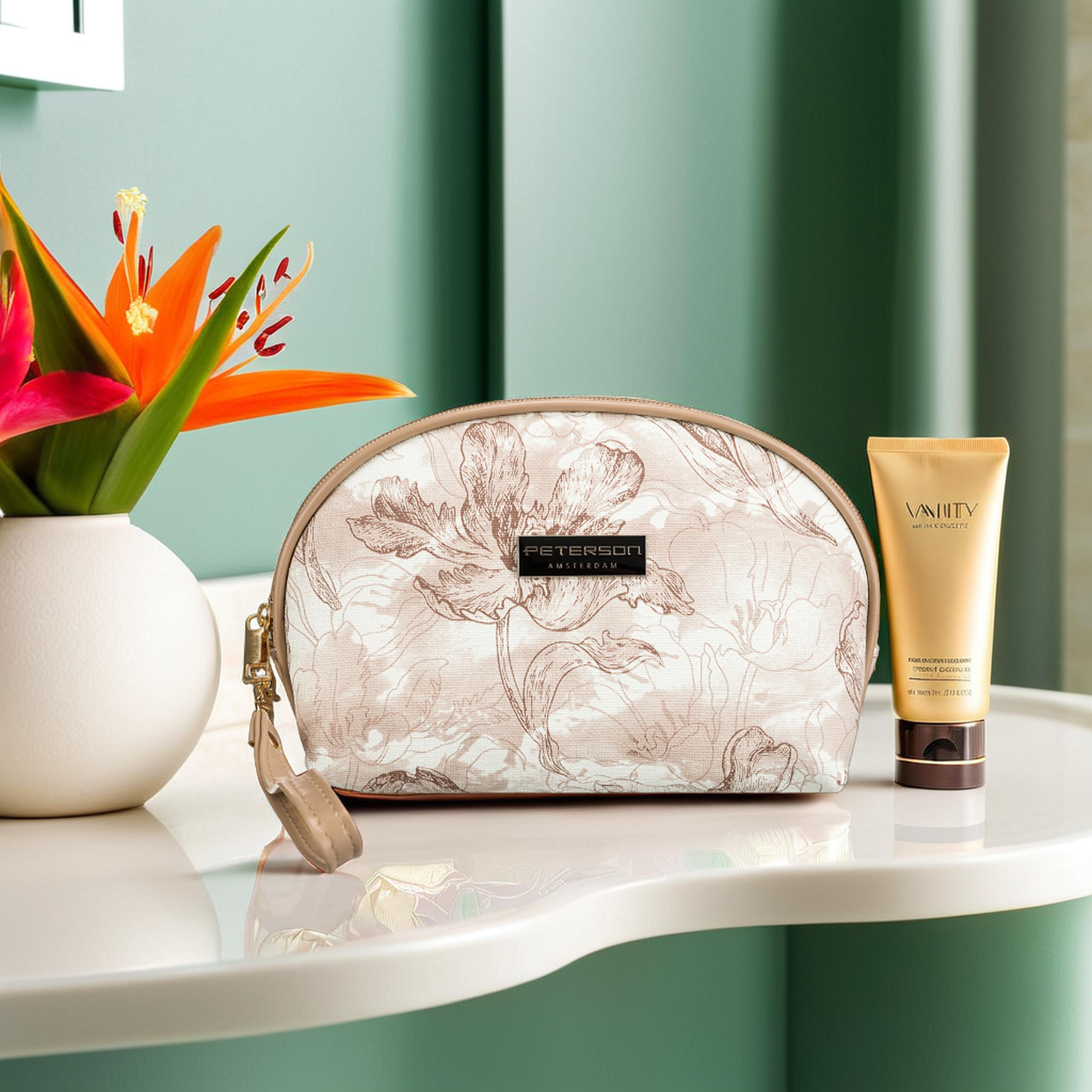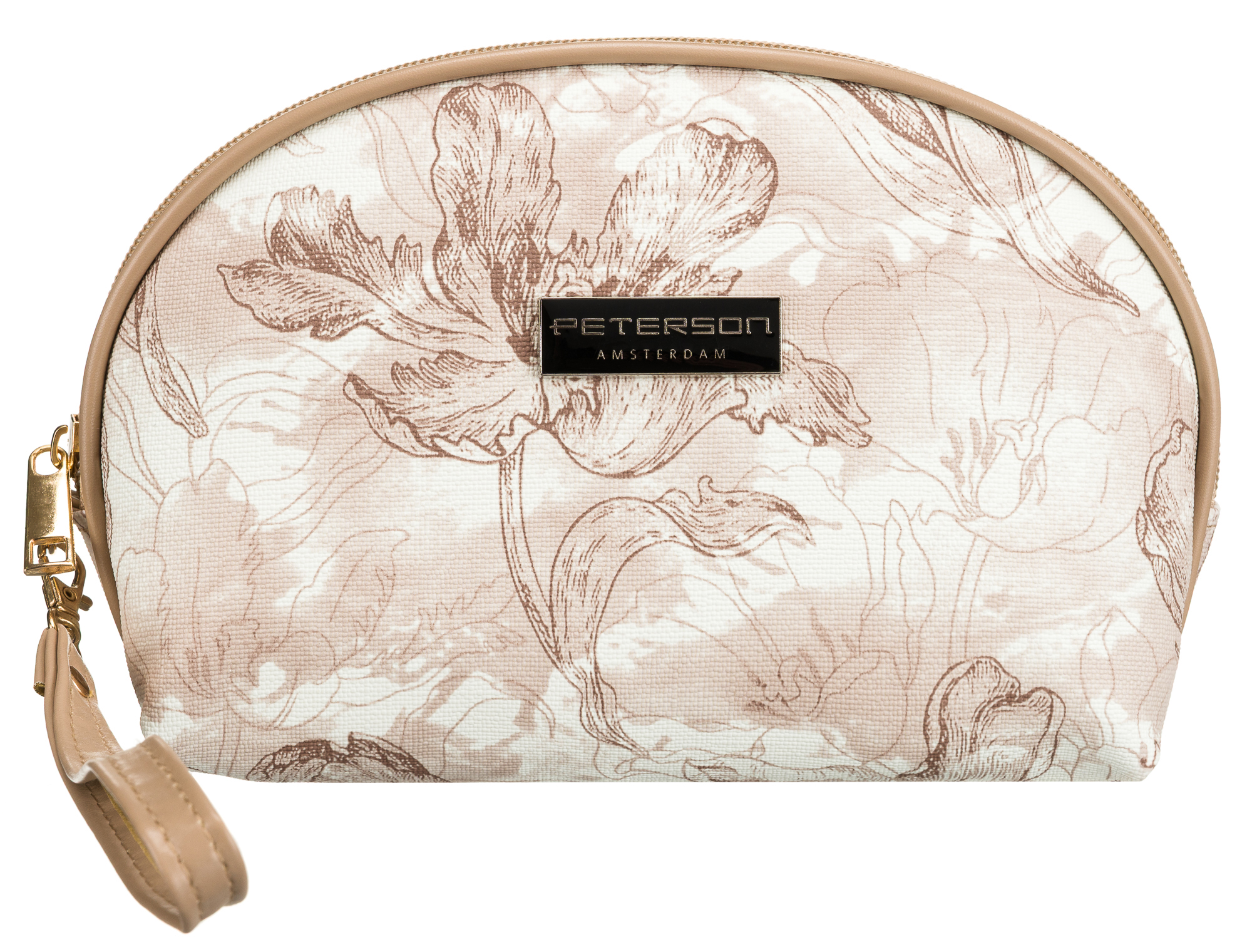 Kompaktowa, beżowa kosmetyczka damska z botanicznym printem - Peterson