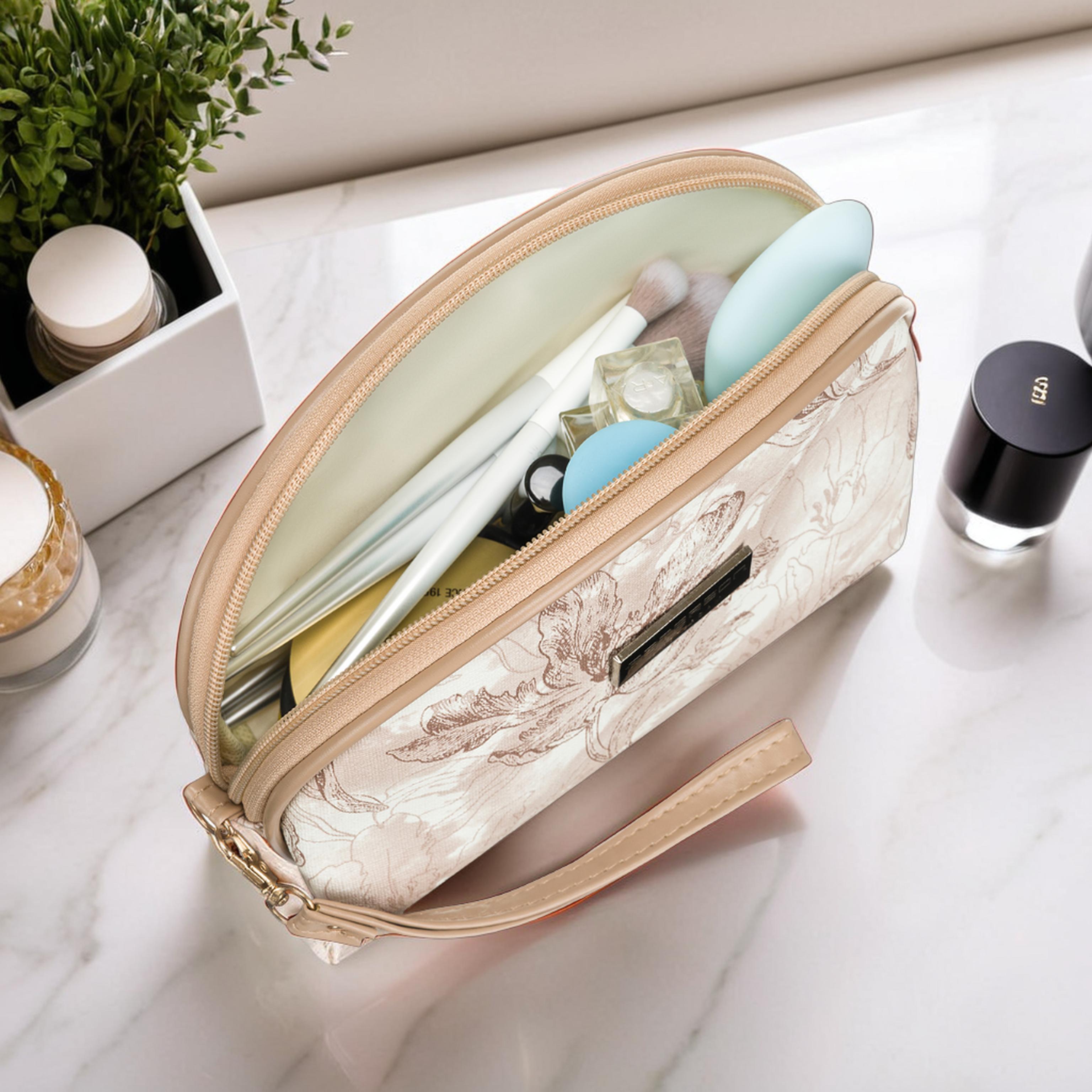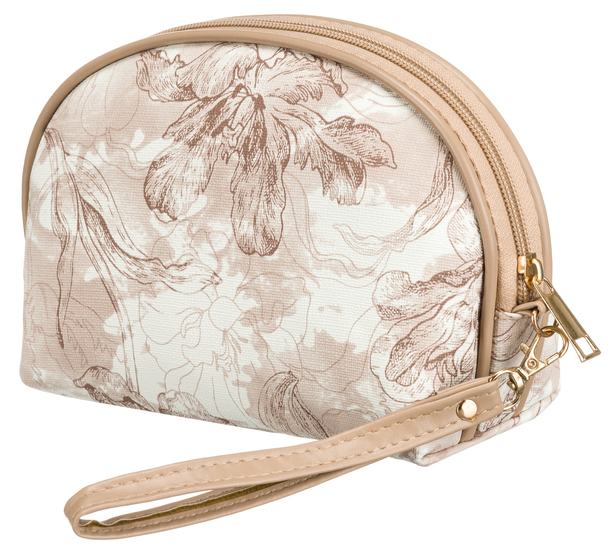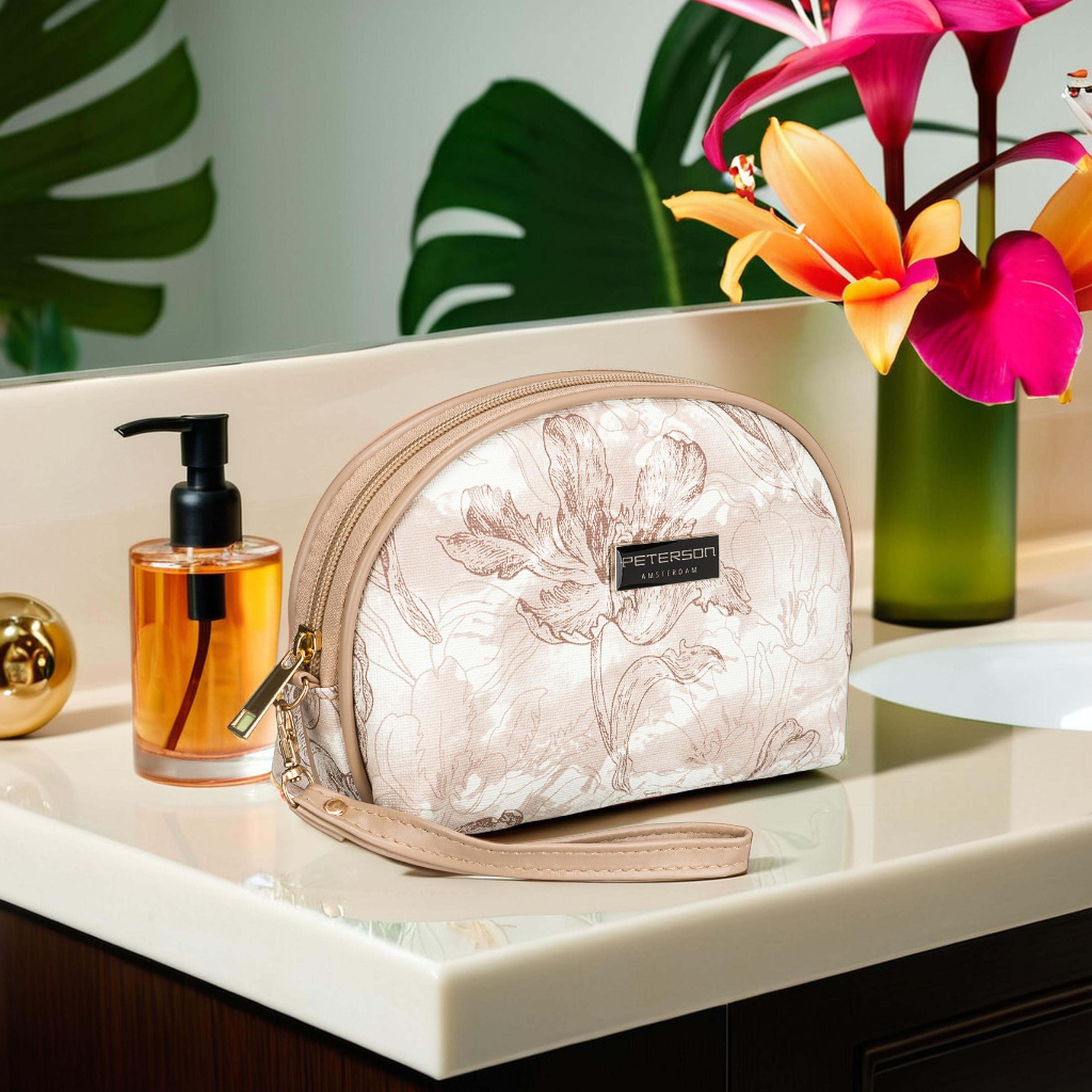 Kompaktowa, beżowa kosmetyczka damska z botanicznym printem - Peterson