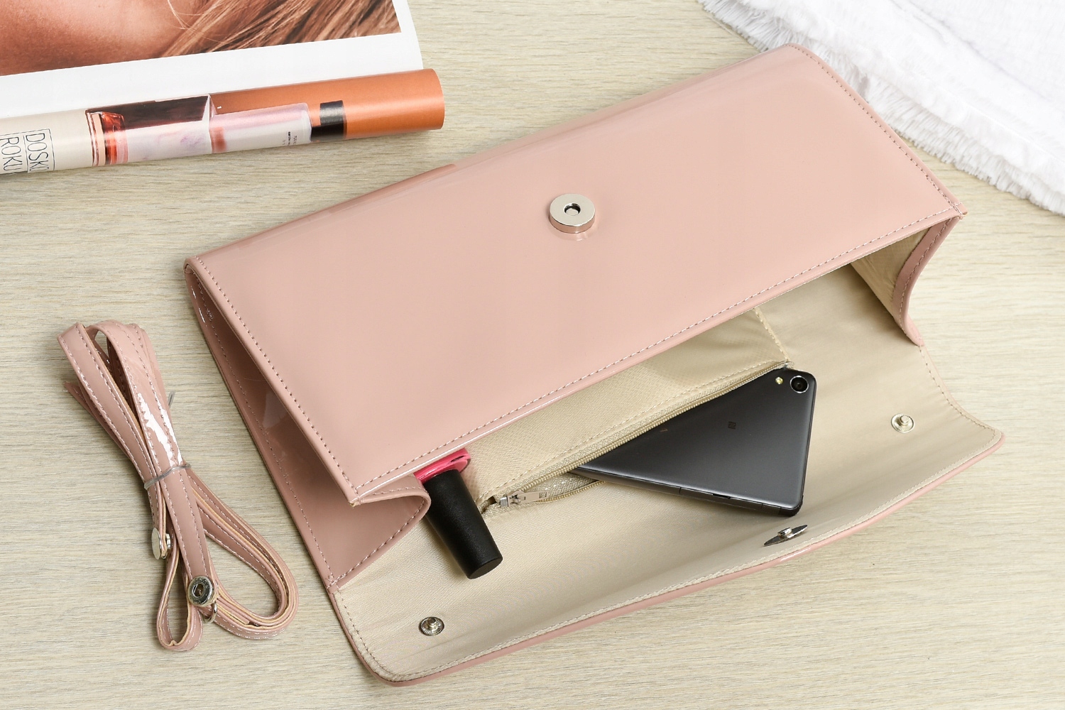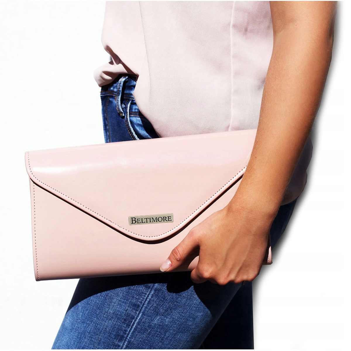 Prezentowana jest kopertówka w kolorze pudrowo-różowym.