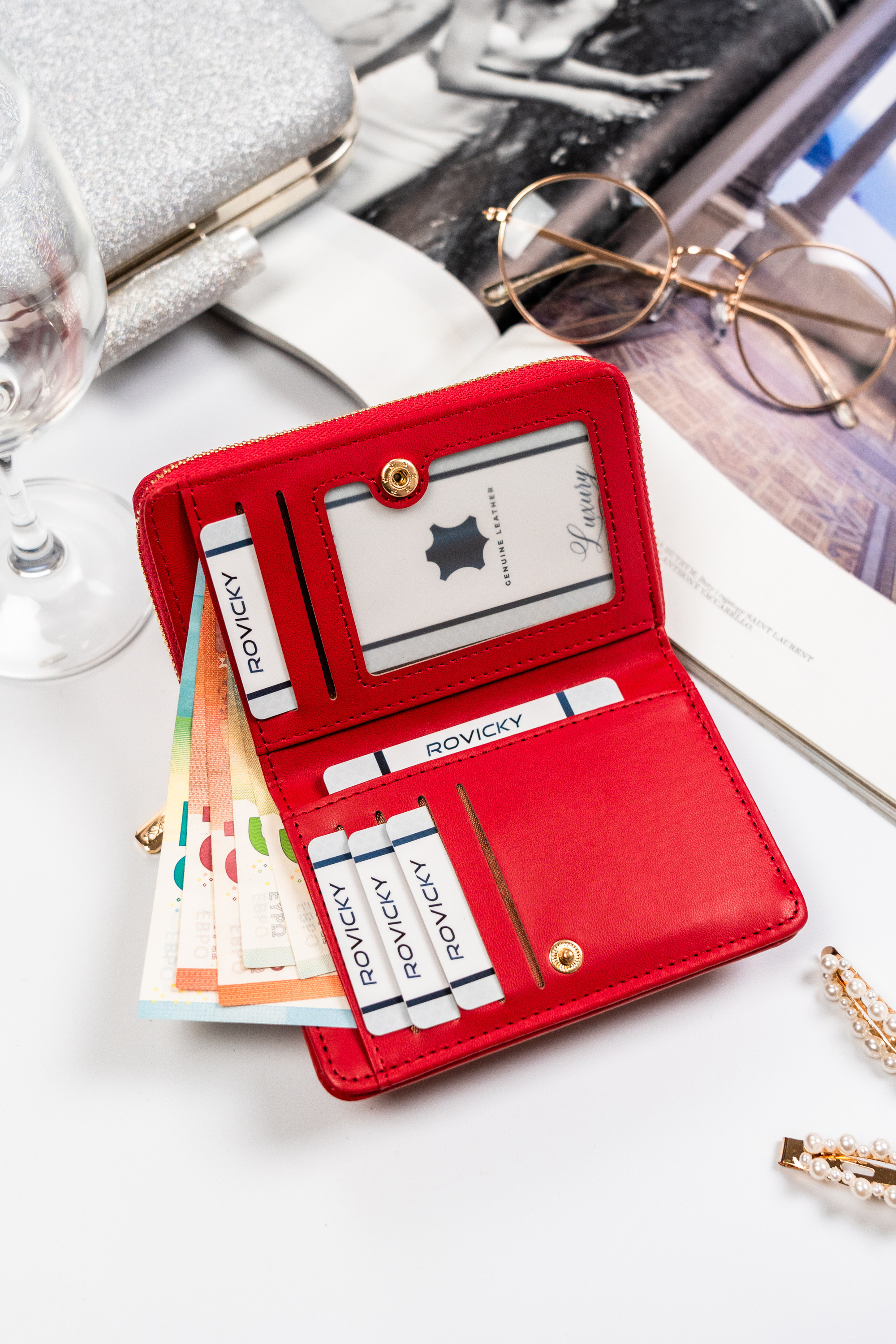Z przodu portfela znajduje się metalowe logo marki Rovicky® w złotym odcieniu nadając całości elegancji.