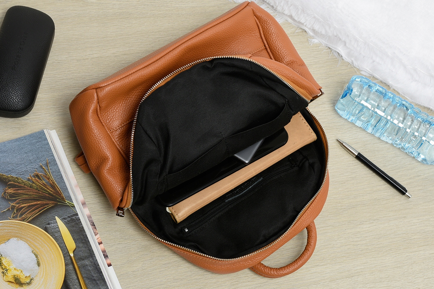 - Skórzana rączka pozwala w wygodny sposób przenosić plecak w ręce, a także zawiesić go na wieszaku lub krześle