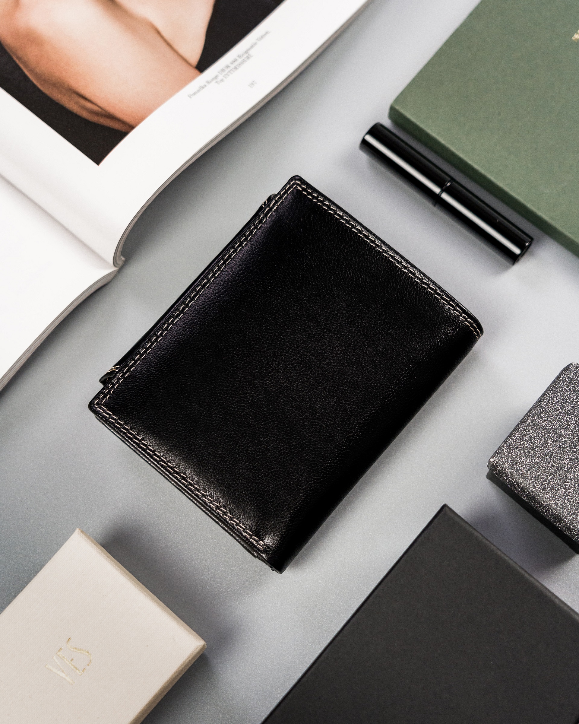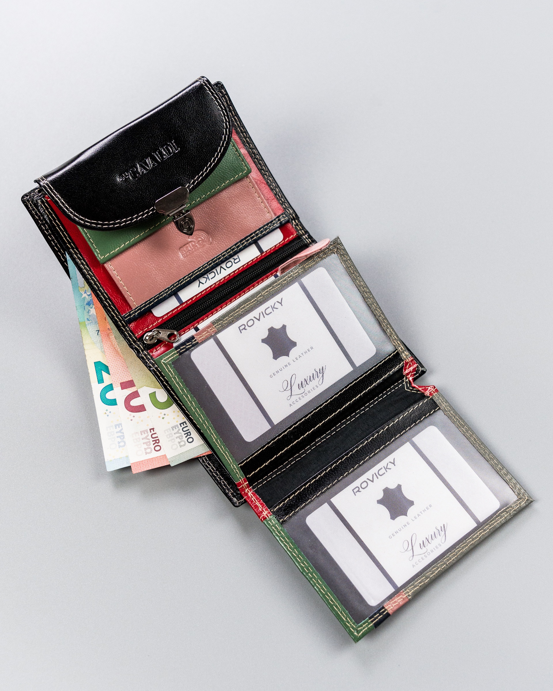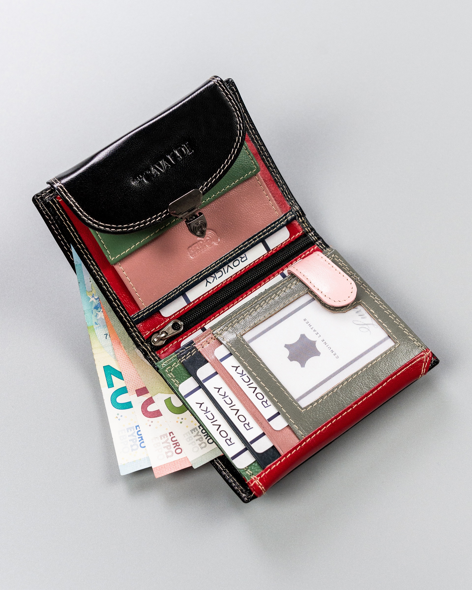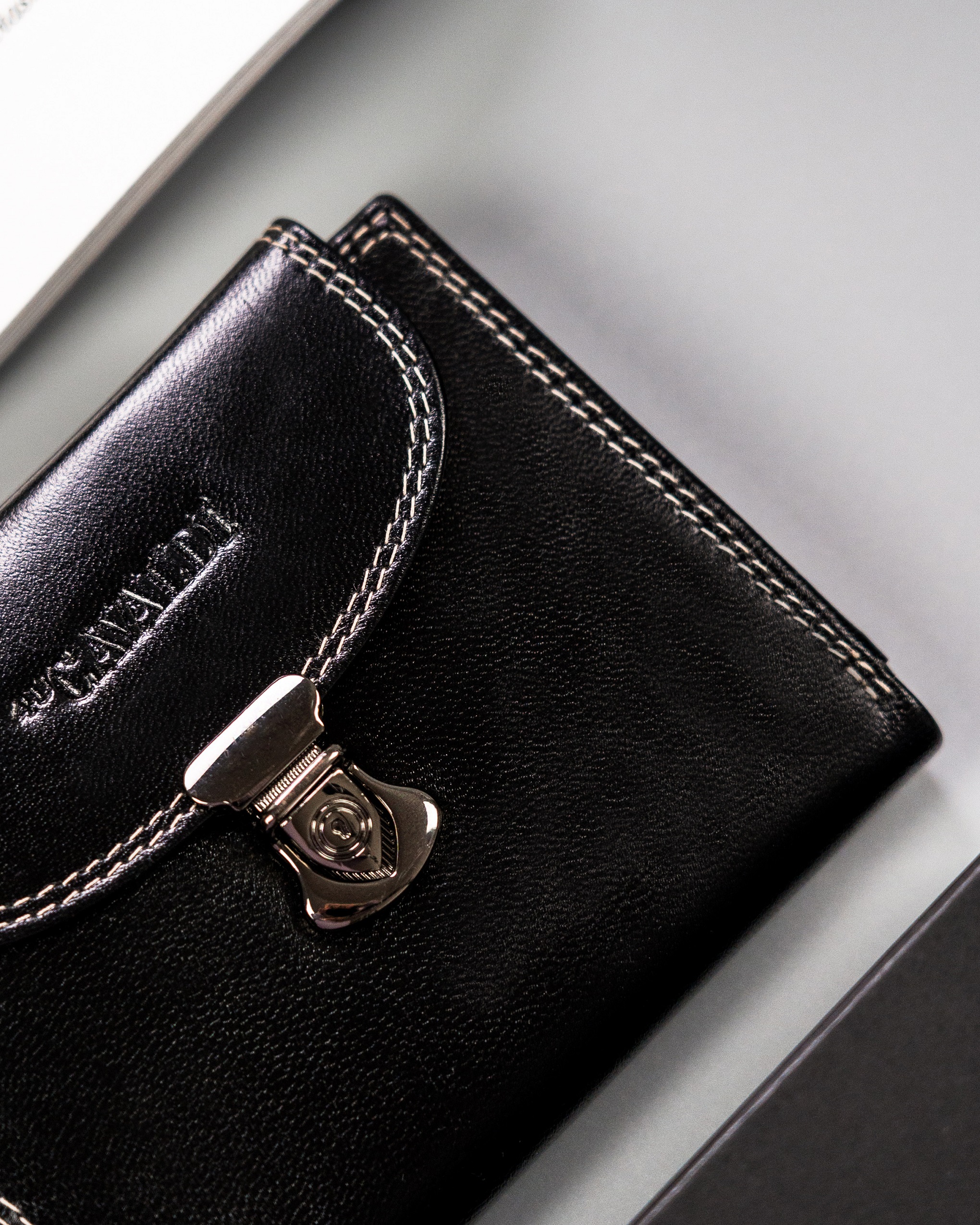 Portfel w orientacji poziomej i zapinany na bezpieczny zatrzask. Jest on skonstruowany w taki sposób, że niemożliwym jest niekontrolowane, samodzielne otwarcie się portfela. Kieszenie na pieniądze, również wyściełane są odporną na otarcia podszewką.