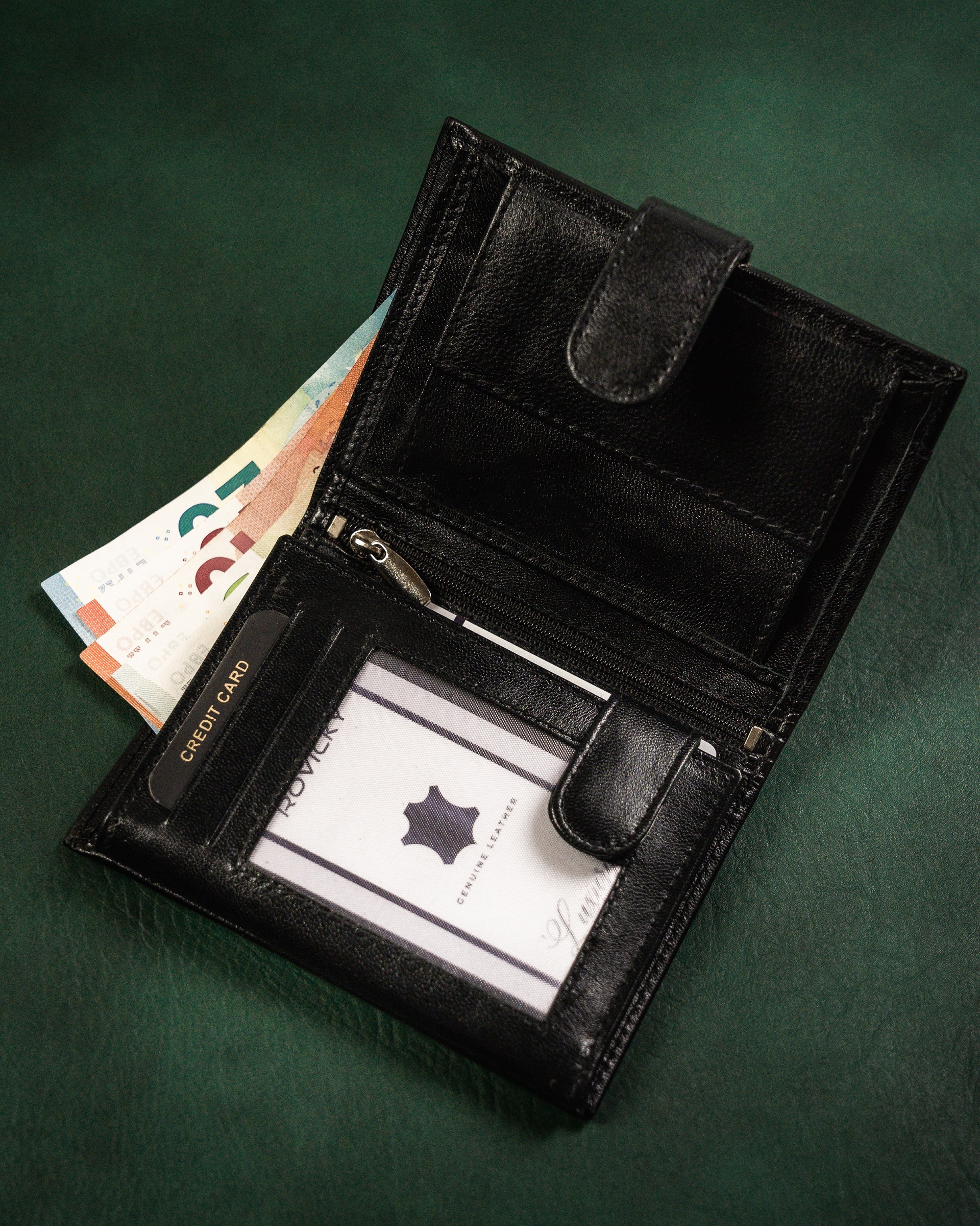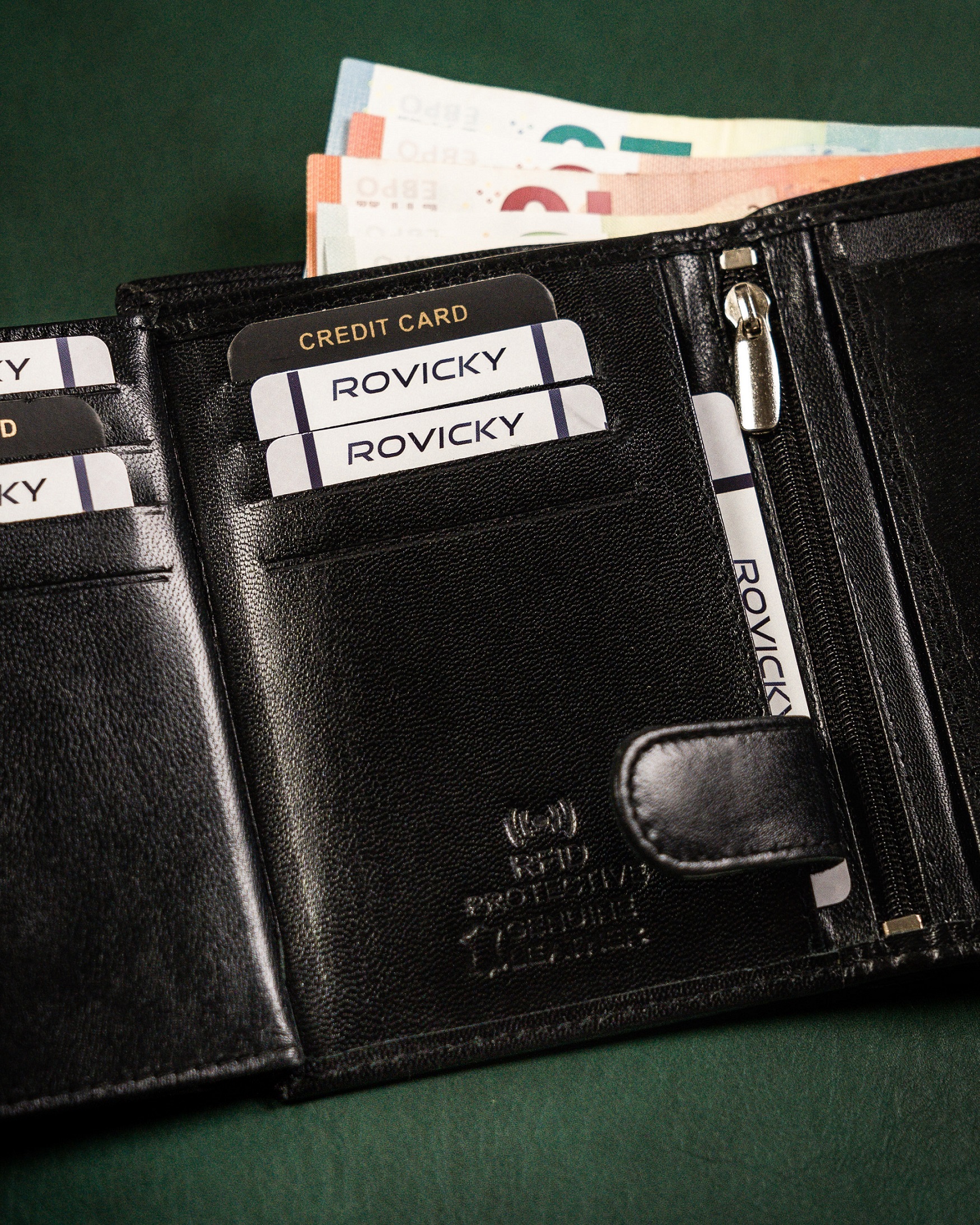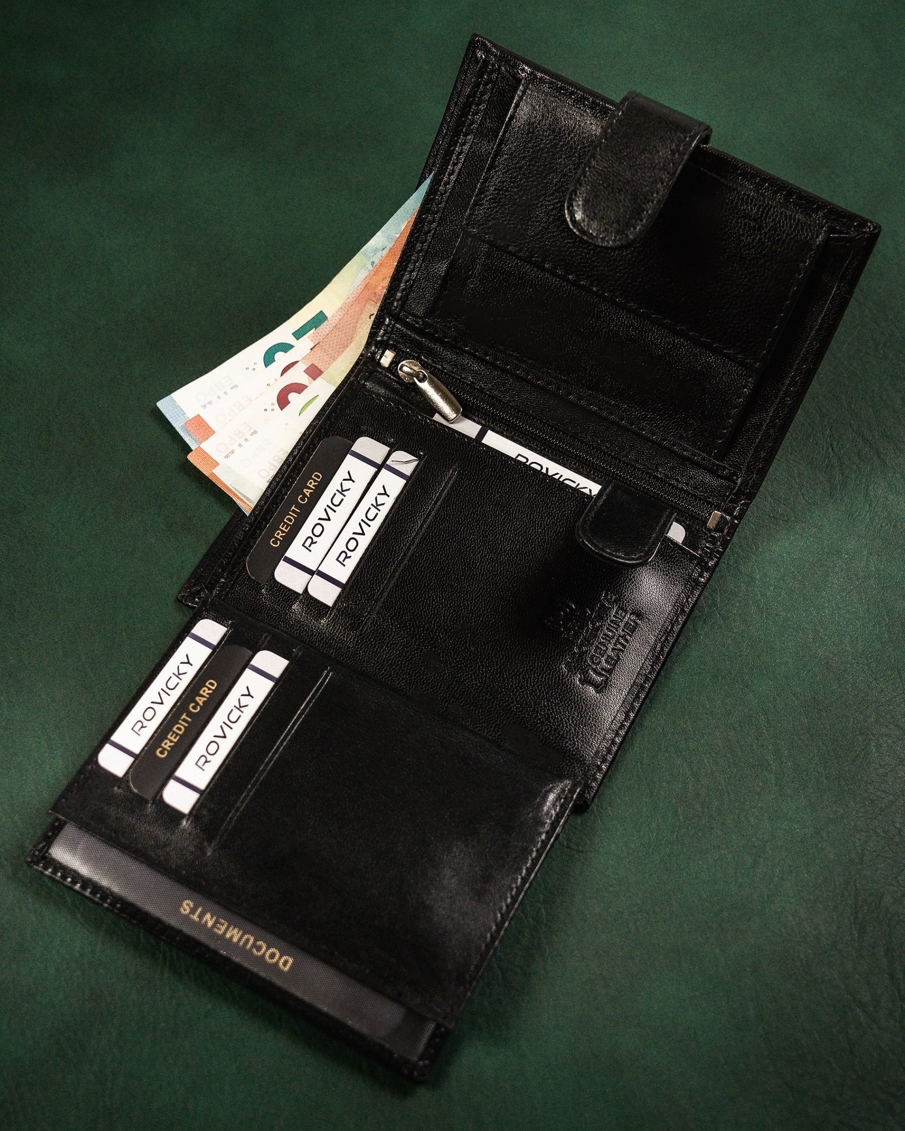 ✅ 1️⃣ schowek na suwak w centralnej części portfela.
