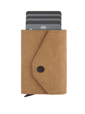 Wewnątrz kieszonka na dokumenty lub wizytówki oraz dodatkowa kieszonka na monety, zamykana klapką. Banknoty przechowasz w unikalnej przegródce wykonanej w całości z papieru Wash Paper. Specjalny mechanizm stopniowego wysuwania kart, zapewnia do nich szybki i łatwy dostęp. Dzięki zastosowanej w konstrukcji portfela technologii blokowania RFID, Twoje wrażliwe dane oraz środki na kartach płatniczych są całkowicie bezpieczne i chronione przed nieautoryzowanym skanowaniem lub kradzieżą.