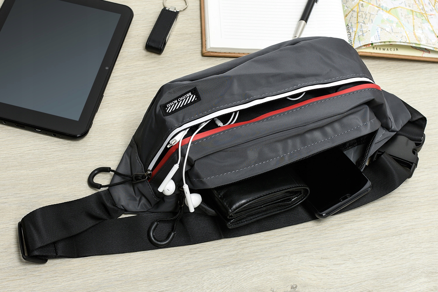 Nerka zbudowana jest z trzech bardzo pojemnych kieszeni, zasuwanych na zamki błyskawiczne.