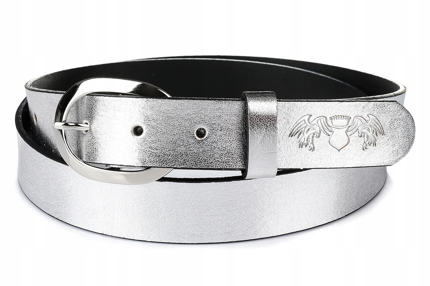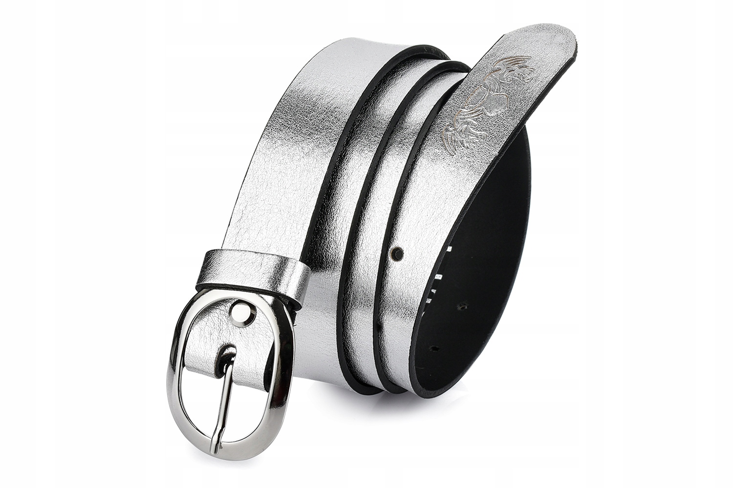 Srebrny odcień tego paska pasuje do wielu damskich stylizacji.