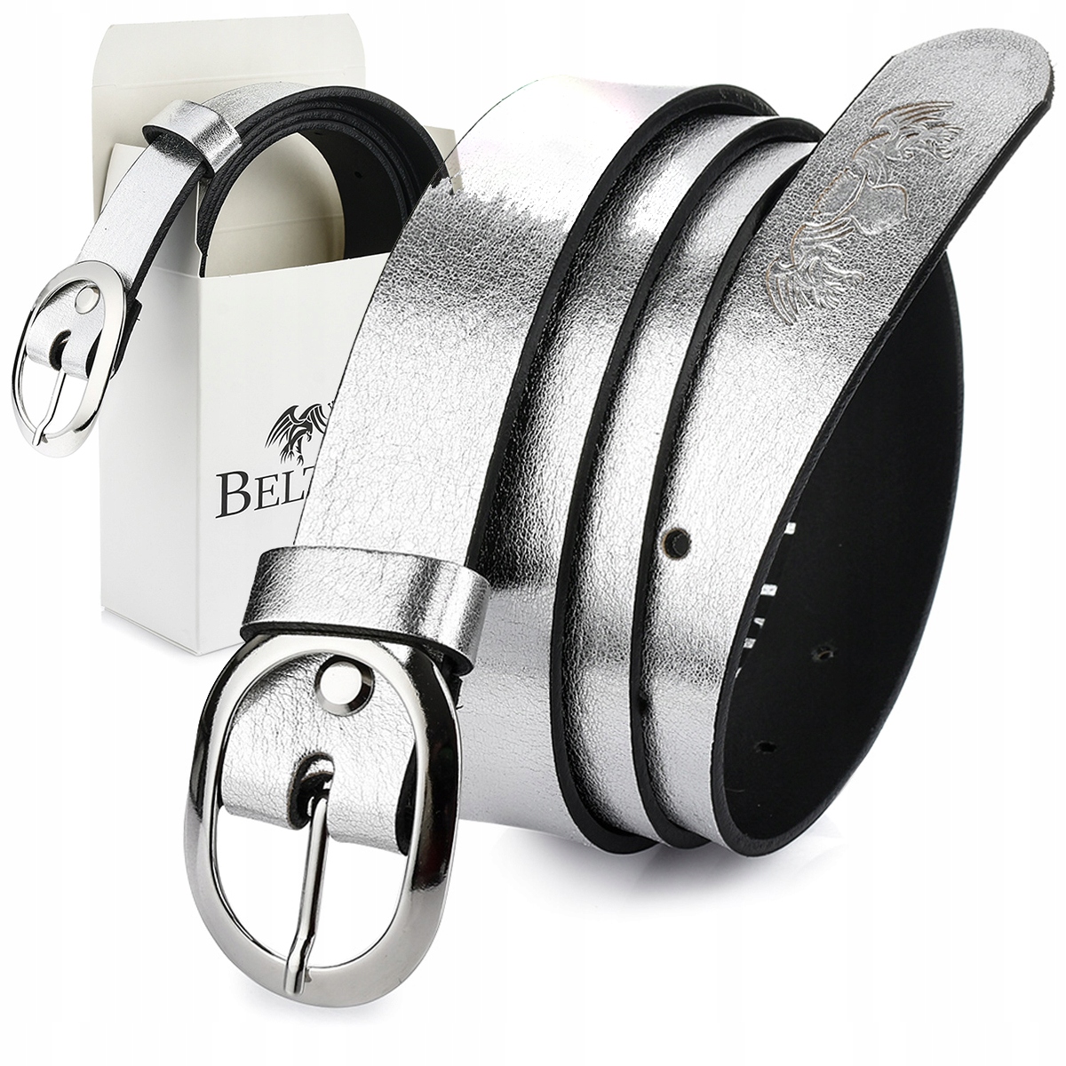 Piękny, skórzany, damski pasek do spodni marki Beltimore. Jest wytrzymały, solidny i w eleganckim, srebrnym kolorze.
