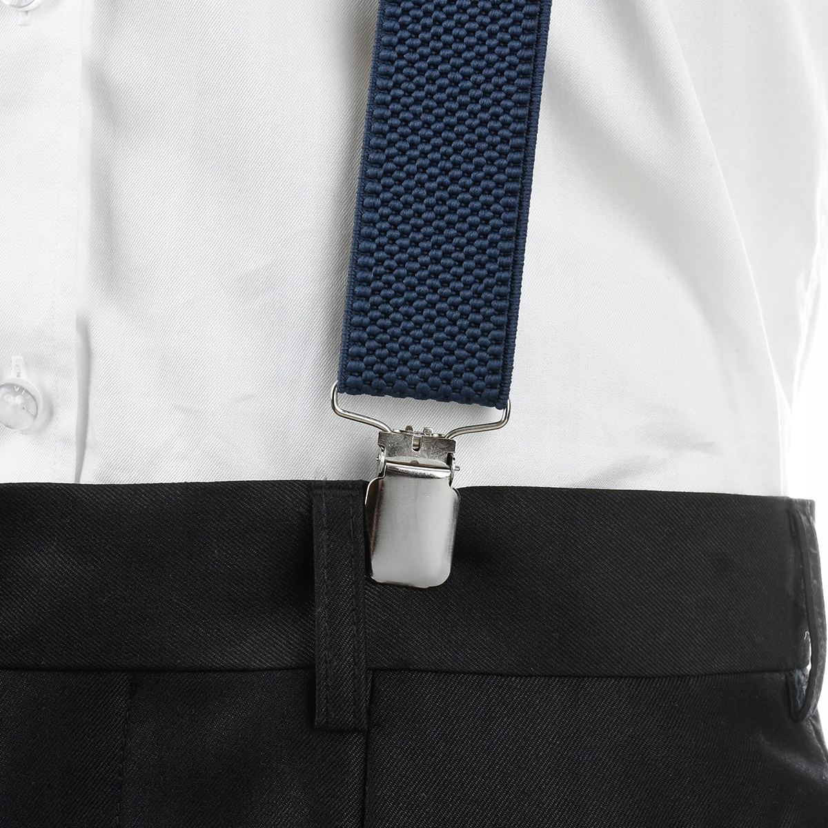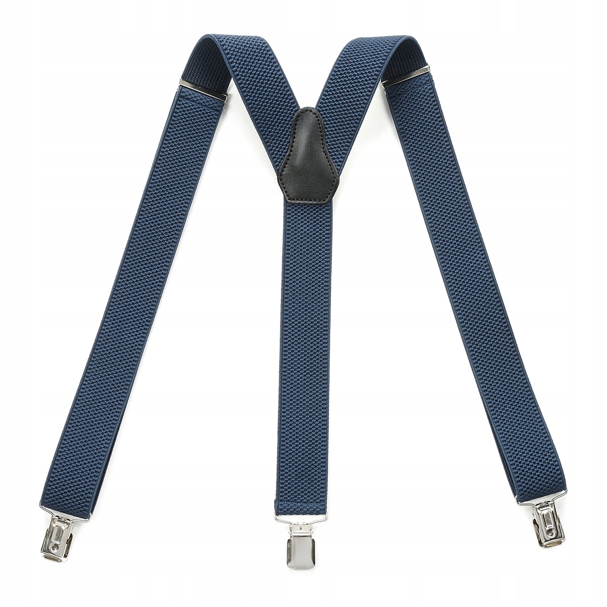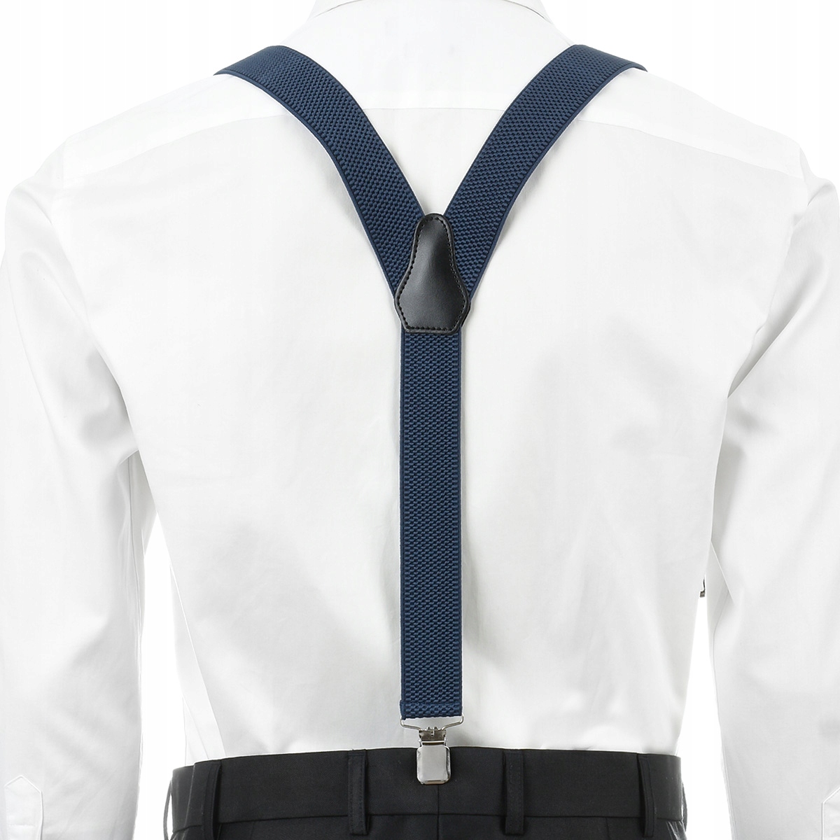 Szelki męskie świetnej jakości z regulacją długości w kształcie V w granatowym kolorze.