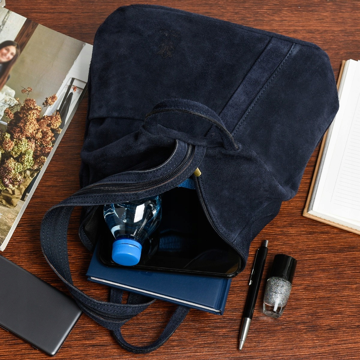 - Kieszenie wewnętrzne: - 2 boczne, małe, na telefon, klucze lub inne drobiazgi: 1 zasuwana i 1 otwarta