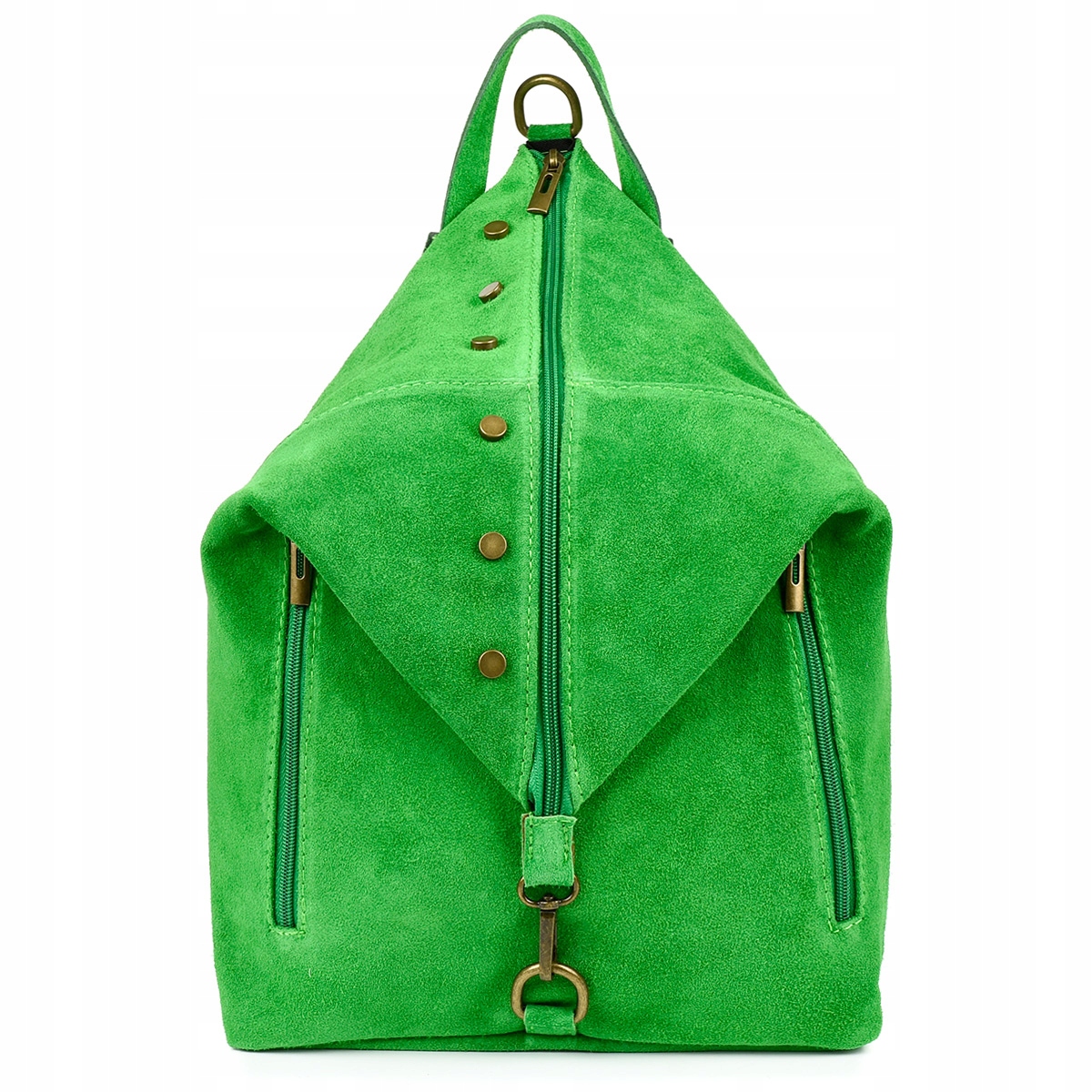 Jest uniwersalny i dobry na każdy sezon, świetnie sprawdzi się do pracy, szkoły, na uczelnię. Front ozdabia stylowy, wyrazisty suwak z dużym, masywnym złotym uchwytem oraz widoczne na zdjęciach ćwieki.