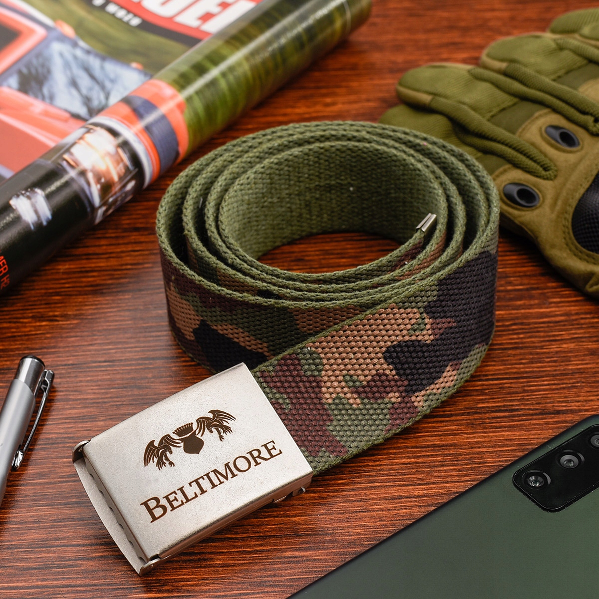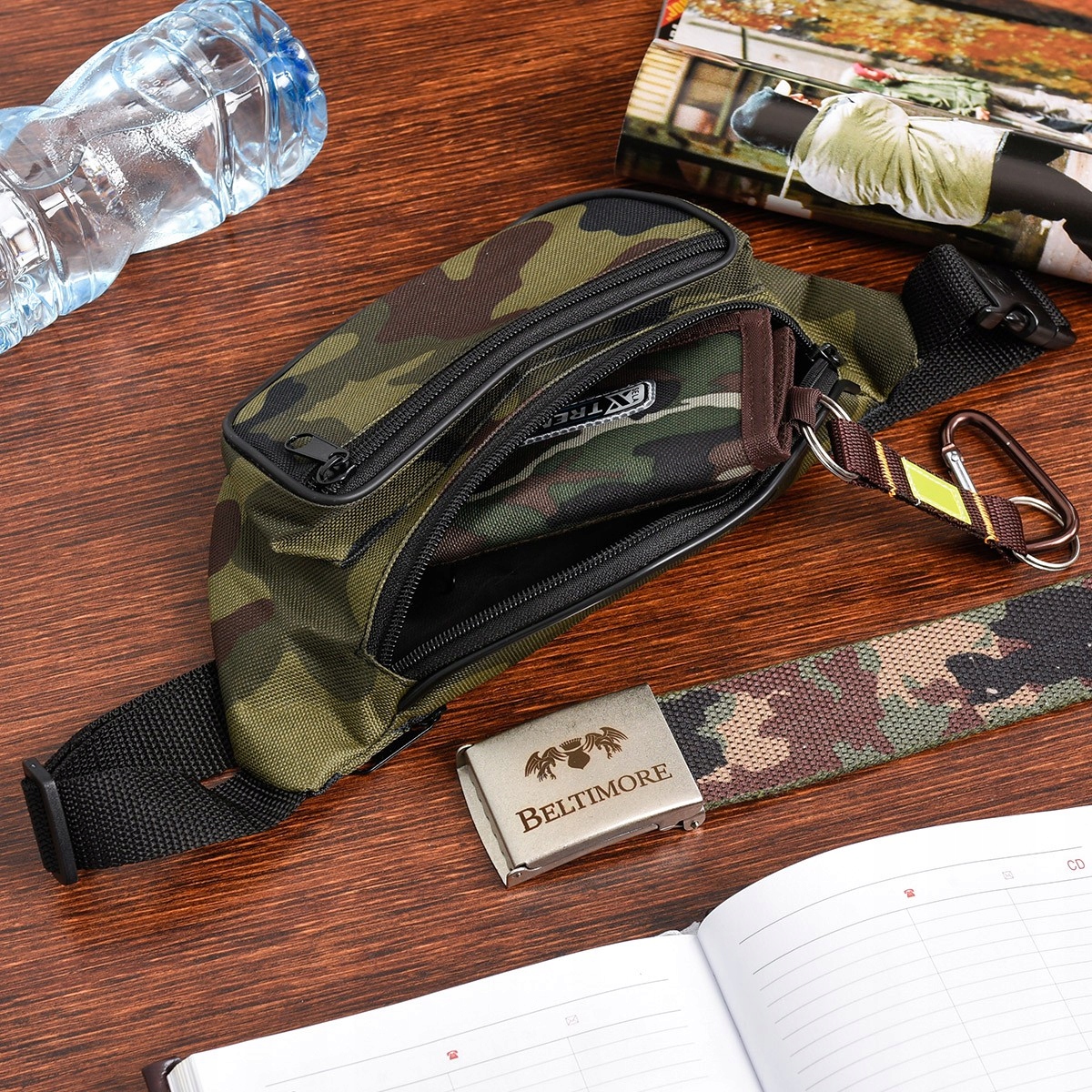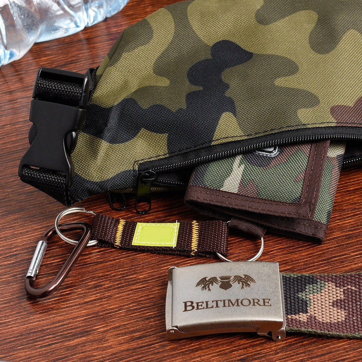 Ekskluzywny, wysokiej jakości, zestaw męski składający się moro saszetki z kodury, moro portfelika na rzep , a także moro paska marki Beltimore®