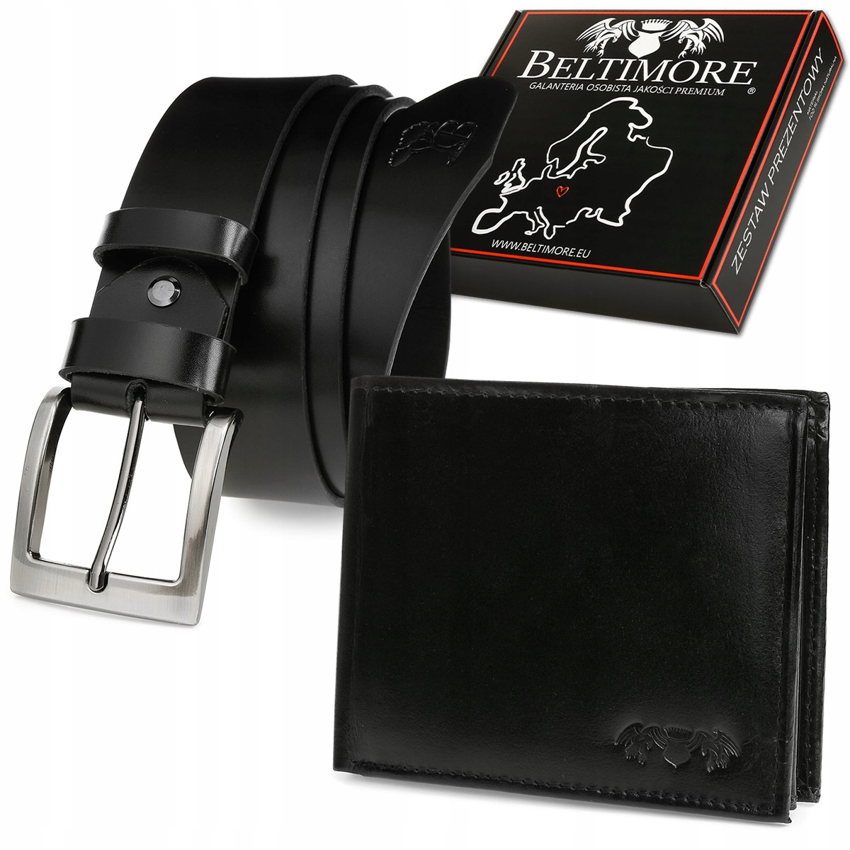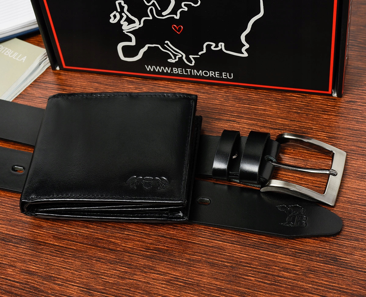 Ekskluzywny, wysokiej jakości, zestaw męski składający się ze skórzanego portfela oraz szerokiego paska marki Beltimore®